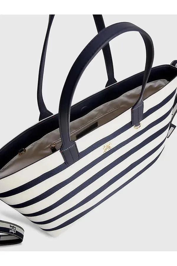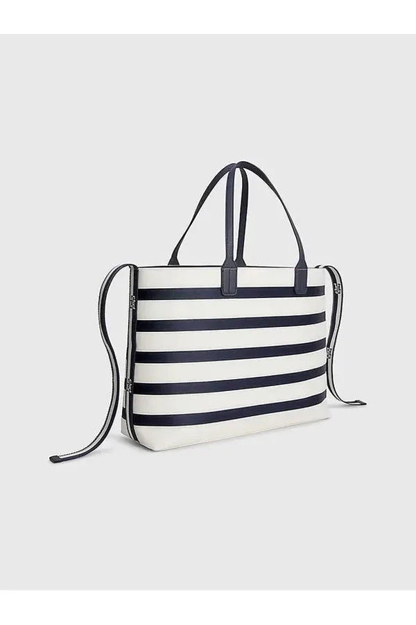 Este atemporal bolso tote de rayas marineras, diseñado con un amplio interior y unas prácticas asas superiores, es un modelo imprescindible para días de trabajo, de viaje o de descanso.