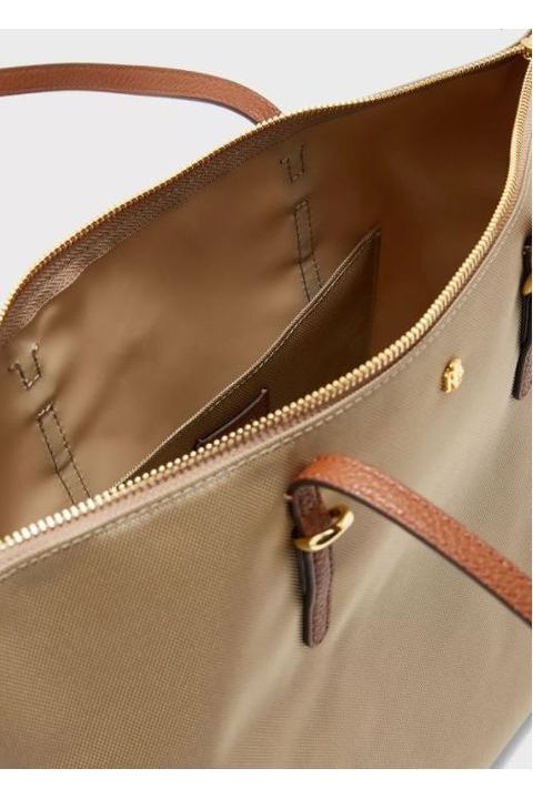 Este bolso tote de nailon duradero presenta detalles en piel sintética y una silueta espaciosa para guardar los elementos esenciales del día.