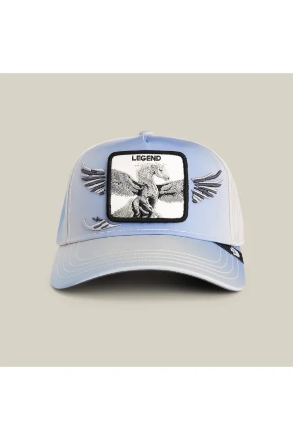 Pegaso en pleno vuelo, rompiendo fronteras con alas que no conocen fronteras. Un desvanecimiento plateado, costuras contrastantes y un parche que no puede contener la leyenda. Elevación, cosida.