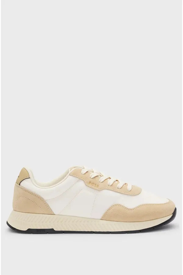 Unas deportivas BOSS Hombre con detalles de la marca por todo el zapato. Este modelo con cordones se ha elaborado en una combinación de materiales con ribetes de ante.
