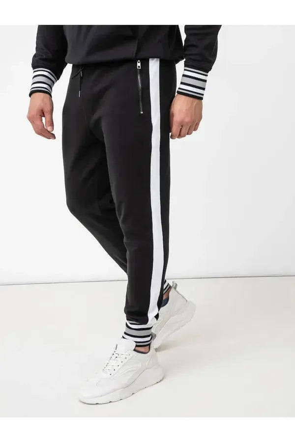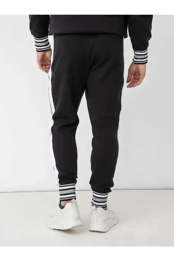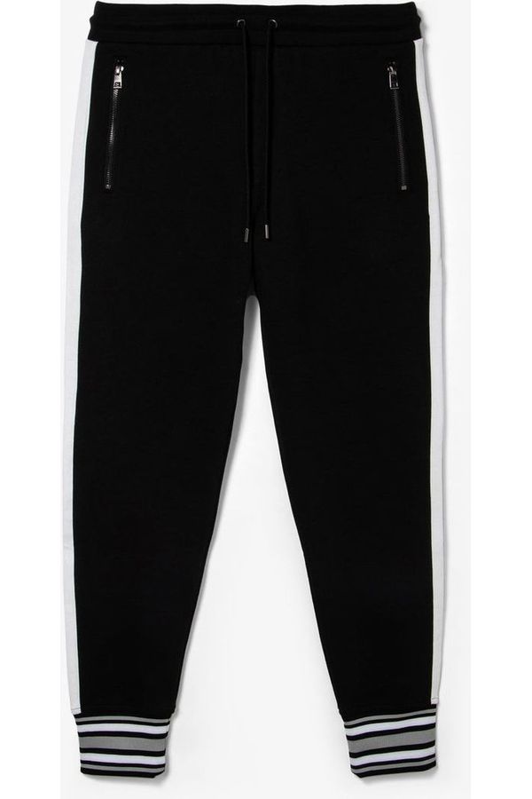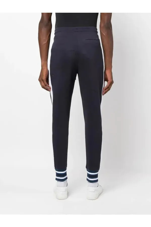 Azul medianoche, mezcla de algodón, tejido, detalle de canalé, detalle de rayas, cierre con cordones en la cintura, dos bolsillos laterales con cierre y bolsillo con ribete en la parte posterior.