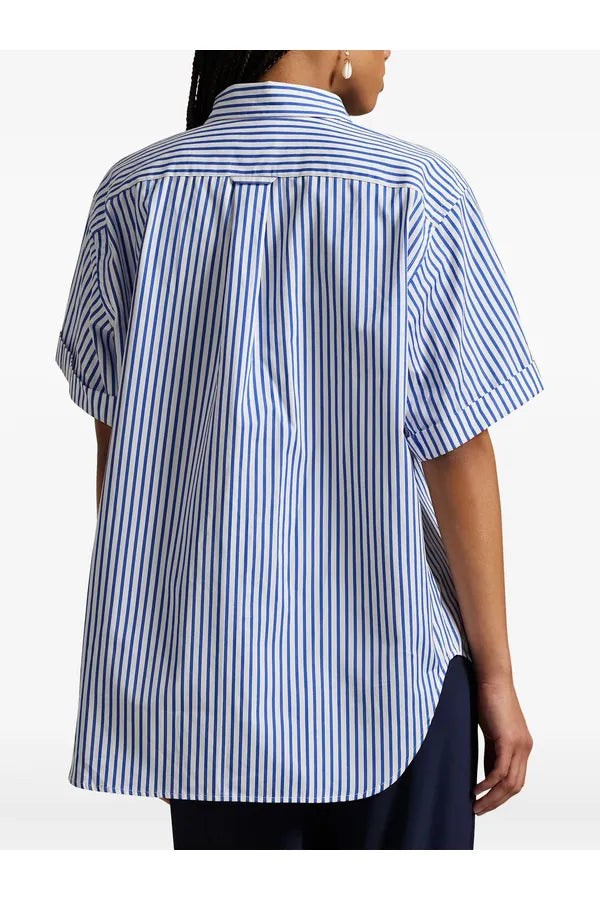Esta camisa de algodón de manga corta con bordes vueltos presenta un motivo de rayas verticales teñido en hilo y el caballo marca de la casa bordado en el pecho.