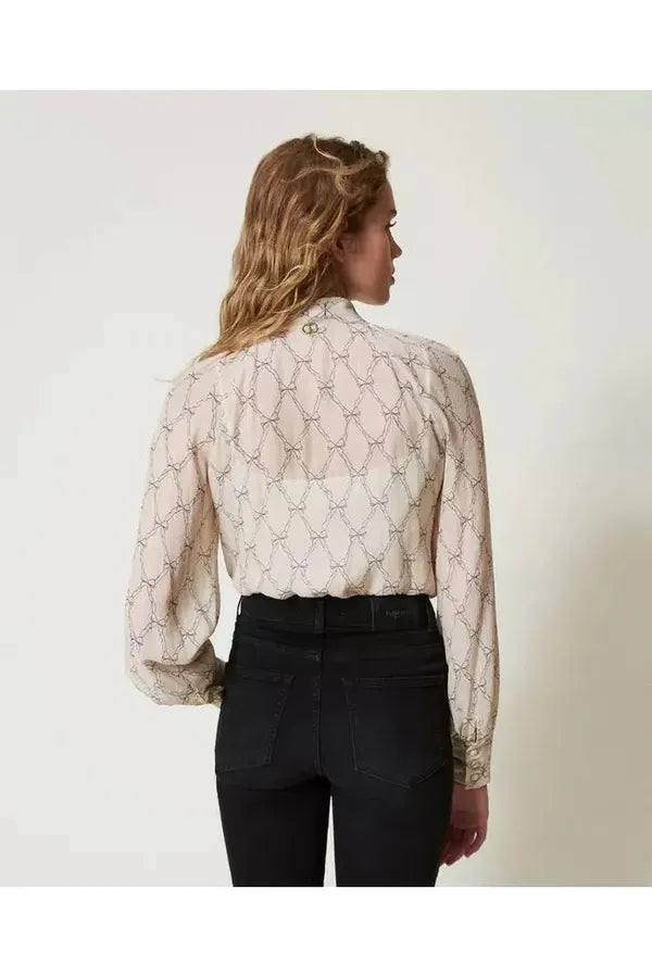 Camisa made in Italy de crepé de viscosa y seda con raya diplomática de lúrex color oro y estampado digital de lazos, diseño exclusivo para Twinset. Tiene cuello con cinta para anudar con lazada, cierre con botones forrados, manga larga con puños y botones, top de crepé de China a juego y es de corte recto.