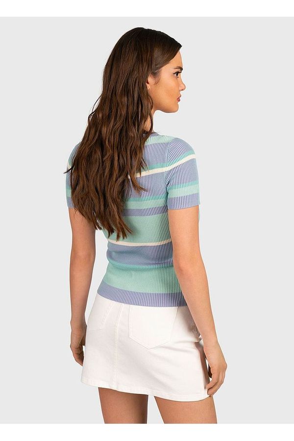 Elegante suéter Adelaide de Guess, confeccionado en una mezcla de viscosa de alta calidad. El modelo destaca por el estampado de rayas y el detalle del logo de metal.