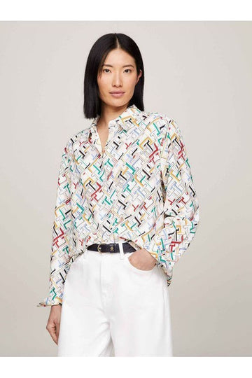 Irradia elegancia sin esfuerzo en tu próxima salida social con esta camisa, confeccionada en tela fluida adornada con un llamativo estampado del monograma TH.