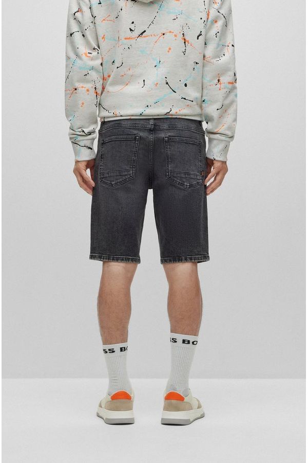 Unos shorts de tiro medio y corte definido BOSS Hombre en cómodo denim elástico negro con efecto flameado.