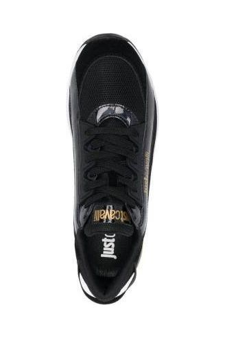 Negro, dorado, diseño de paneles, paneles de malla, panel de ante, detalle brillante, logo estampado en el lateral, parche del logo en la lengüeta, lengüeta con logo en la parte posterior, puntera redonda, cierre con cordones en la parte delantera, plantilla con logo y suela gruesa de goma.