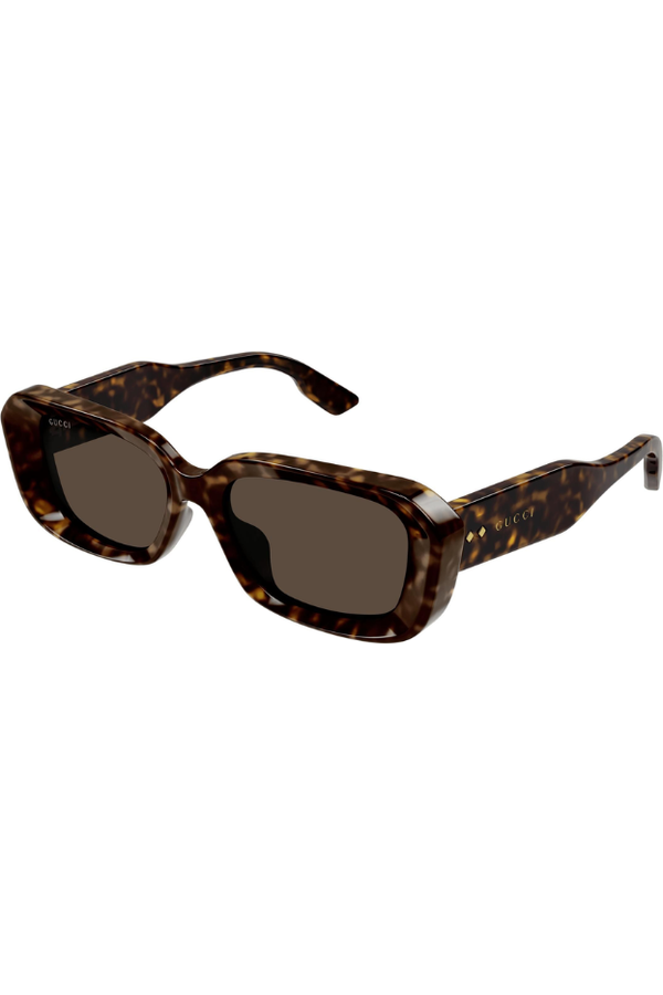 Gafas gruesas y facetadas de acetato que juegan con los volúmenes y las geometrías adornadas con los icónicos remaches. Atrevido diseño geométrico rectangular de acetato. Logotipo con las letras dorado grabado en las varillas y realzado con los icónicos remaches Gucci. Paleta de colores pastel femenina para un look de estilo veraniego.