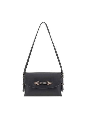 Bolso de hombro modelo Lefia con solapa imantada, doble asa ajustable, logotipo frontal metálico Guess en tono dorado y compartimiento exterior posterior con cierre cremallera.