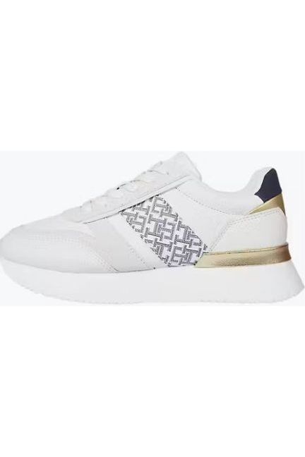 Estas zapatillas presentan un diseño de paneles de piel texturizada y ante, con ribetes metalizados y un estampado integral del monograma TH en el lateral.
