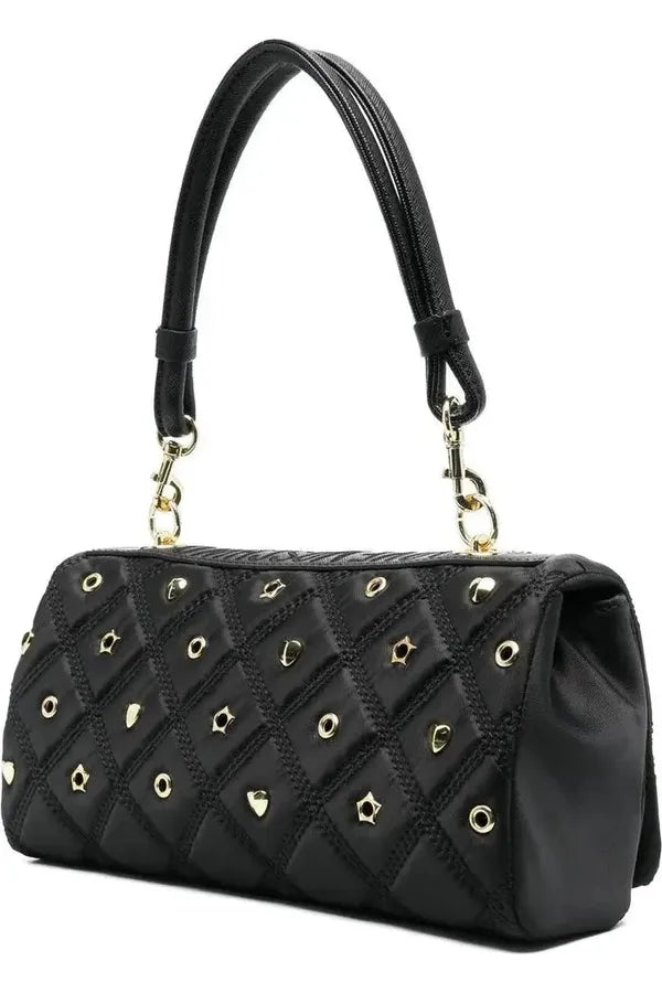 Apliques en tono dorado, letras del logo en tono dorado, correa removible para el hombro, parte superior plegable con cierre magnético, compartimento principal, bolsillos internos con cierre y placa del logo en el interior.