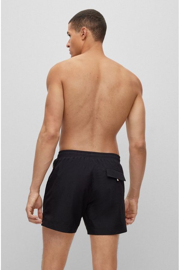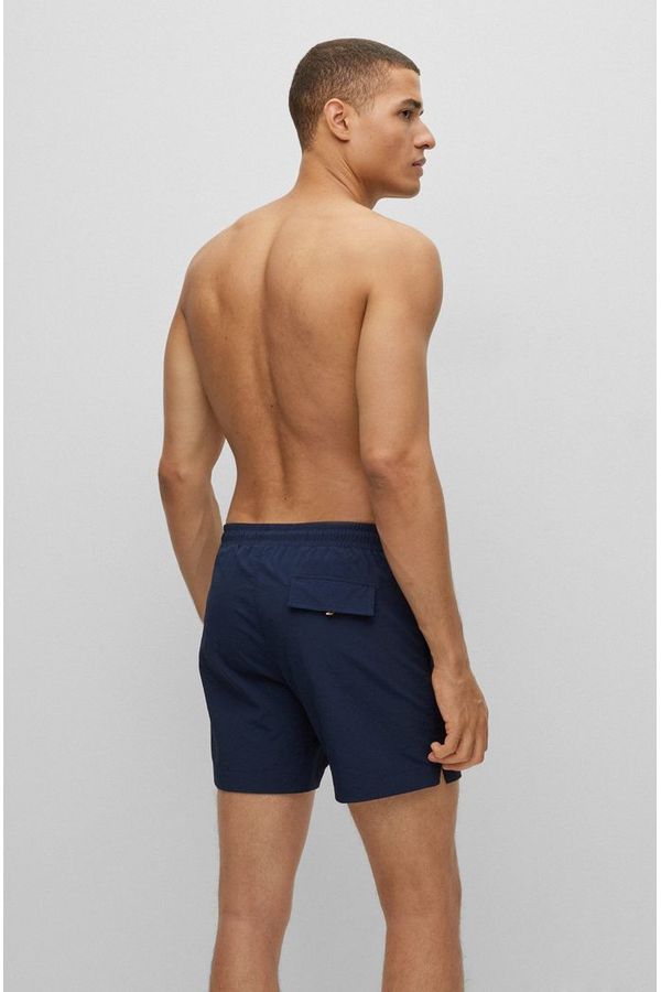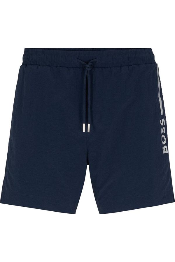 Elegante bañador BOSS con cintura elástica con cordón. Confeccionado en tejido de secado rápido con forro completo para mayor comodidad, este bañador se presenta con un logo BOSS estampado con efecto metalizado y una raya en la pernera izquierda. En nuestros productos RESPONSIBLE siempre utilizamos como mínimo un 60 % de materias primas más sostenibles. Esta prenda se ha fabricado con un mínimo del 60 % de poliamida reciclada certificada. Utilizamos poliamida reciclada porque queremos ahorrar recursos aprovechando materiales plásticos ya existentes. El nylon reciclado se fabrica normalmente con hilado de desecho industrial o restos de tejidos, pero también puede provenir de redes de pesca industrial posconsumo. Solo utilizamos materias primas con una cadena de custodia certificada para garantizar el uso de poliamida reciclada certificada.