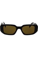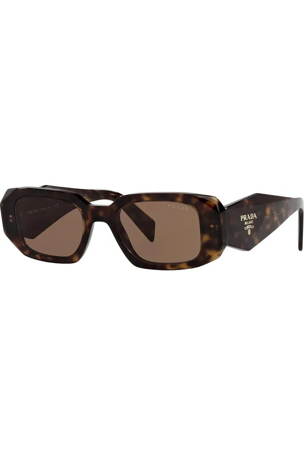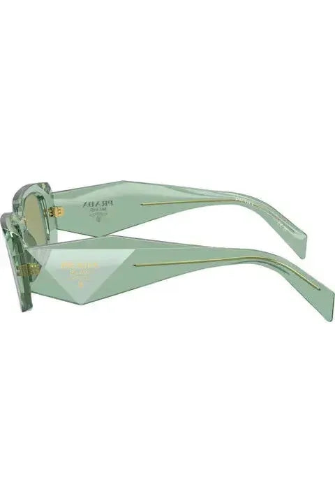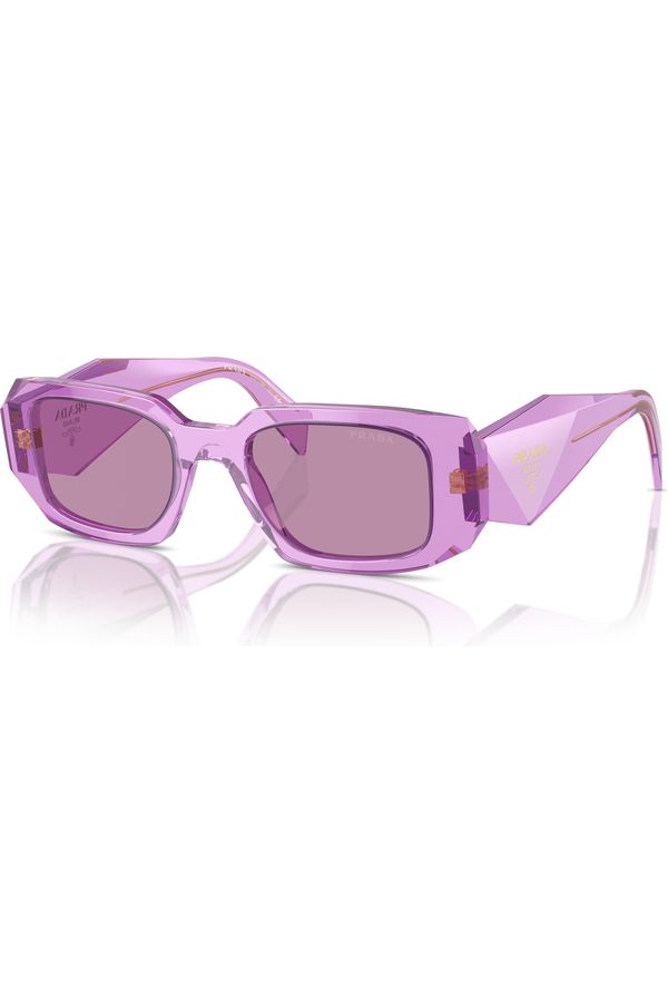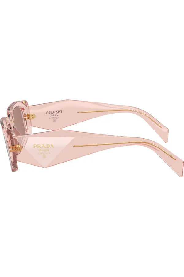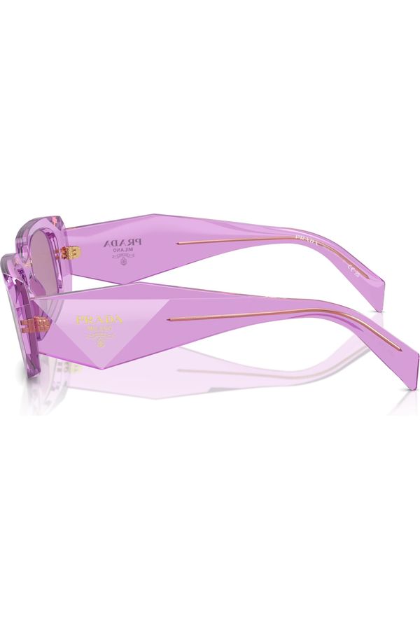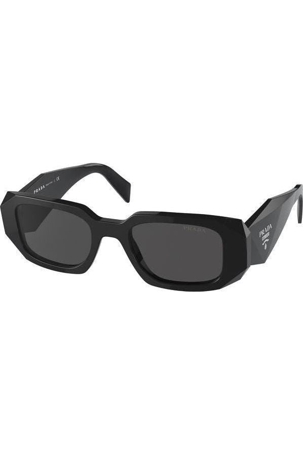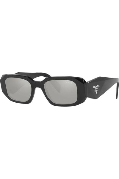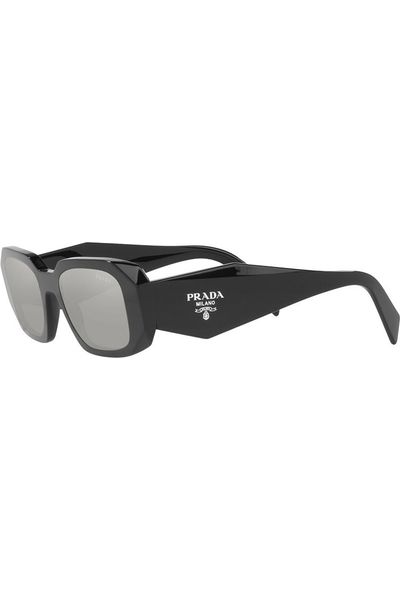 Gafas de sol de acetato con un diseño geométrico extragrande. El llamativo frontal de la montura presenta un diseño vanguardista que se caracteriza por el corte en ángulo pronunciado de las esquinas exteriores. El diseño tridimensional de las patillas está adornado con una interpretación iconográfica del tradicional logo Prada.