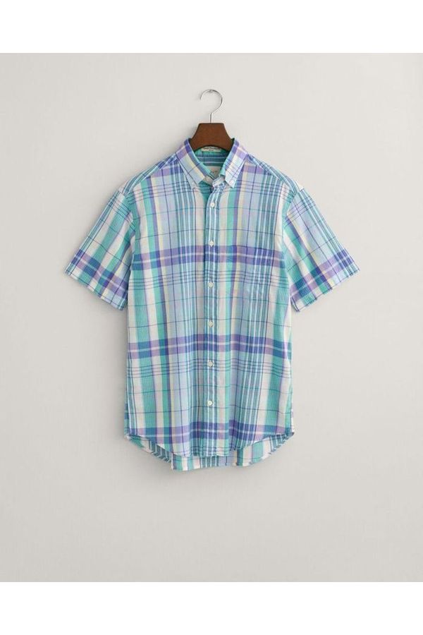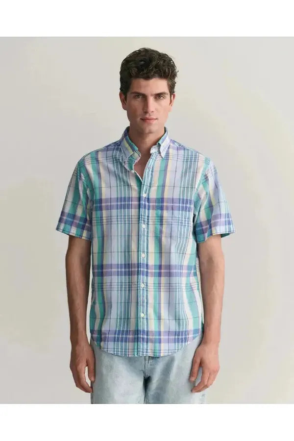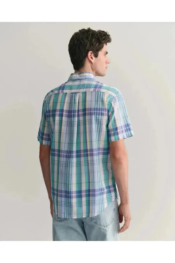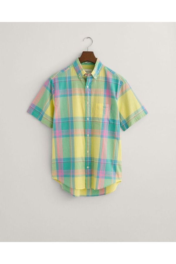 Esta camisa de manga corta, confeccionada en un ligero tejido de madrás, presenta un corte normal para llevar por fuera del pantalón y cuello abotonado clásico. Se trata de una prenda con estampado integral de cuadros que también cuenta con bajo curvado, el logotipo GANT bordado en el bolsillo del pecho y fuelle con nuestra inconfundible trabilla en la espalda.