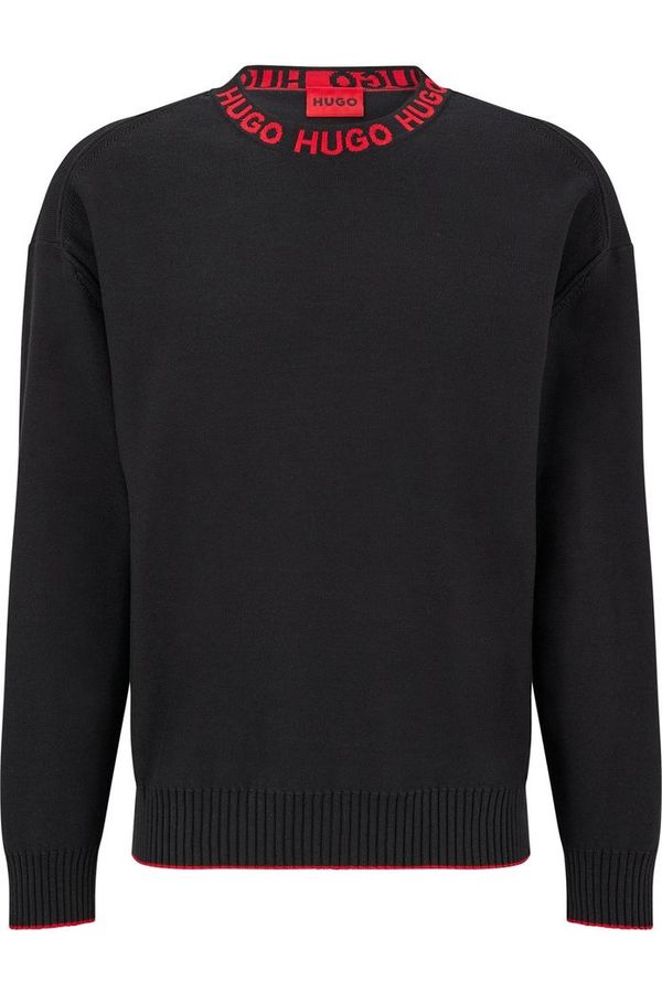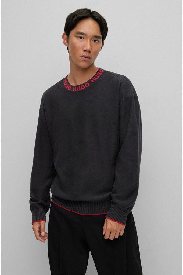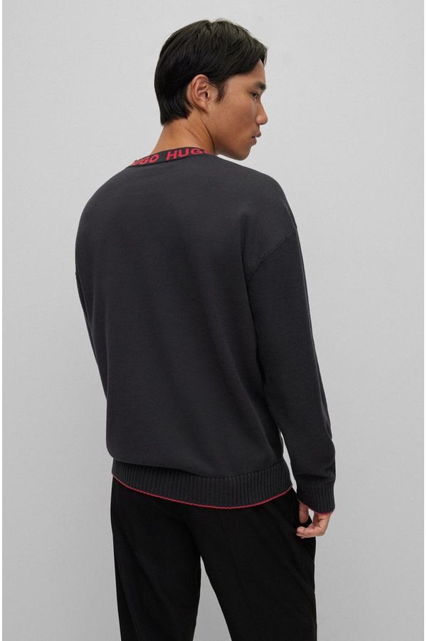 Jersey oversize de HUGO Hombre. Con ribetes en contraste en el dobladillo y los puños, este suéter moderno se detalla con un logo jacquard repetido en el cuello para darle un toque distintivo. Para nuestros productos RESPONSABLES, utilizamos siempre al menos un 60% más de materias primas sostenibles. Esta prenda está confeccionada con al menos un 60% de algodón orgánico certificado. El algodón orgánico solo se cultiva con sustancias naturales y sin semillas modificadas genéticamente. La agricultura orgánica fomenta el uso de medidas naturales, como la rotación de cultivos y el compostaje, para controlar plagas y enfermedades en lugar de depender de productos químicos.