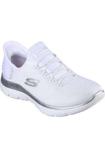 Aumenta el ritmo, cálzate sin agacharte y disfruta de la máxima comodidad con Skechers Hands Free Slip-ins®: Summits - Diamond Dream. Diseñado con nuestro exclusivo sistema Heel Pillow™, este modelo vegano cuenta con una parte superior de malla, cordones elásticos, media suela con ribete metálico y una cómoda plantilla Skechers Air-Cooled Memory Foam® con amortiguación.