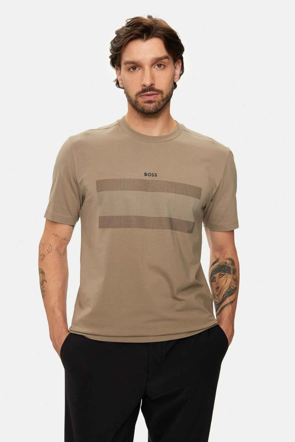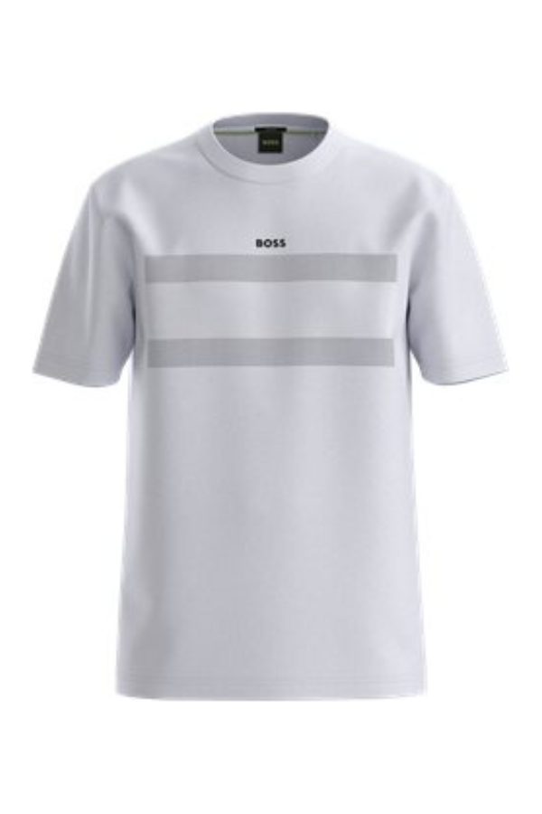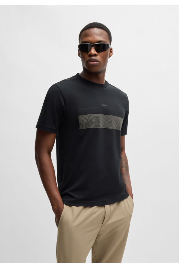 Una camiseta BOSS de estilo casual en punto de algodón elástico. Esta prenda regular fit está decorada con un logo pequeño y un diseño de bandera.