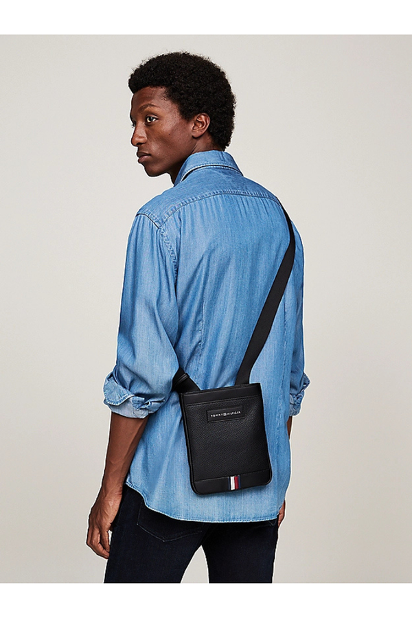 • Logo metalizado de Tommy Hilfiger en la parte delantera