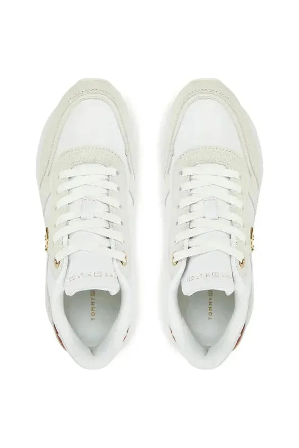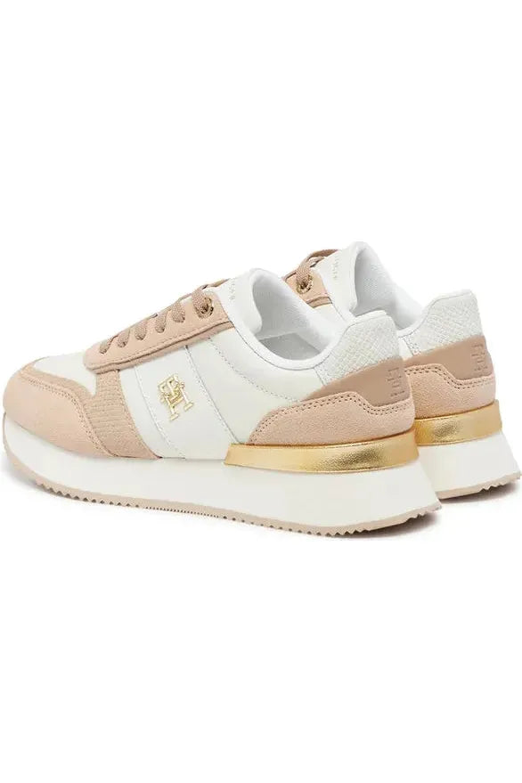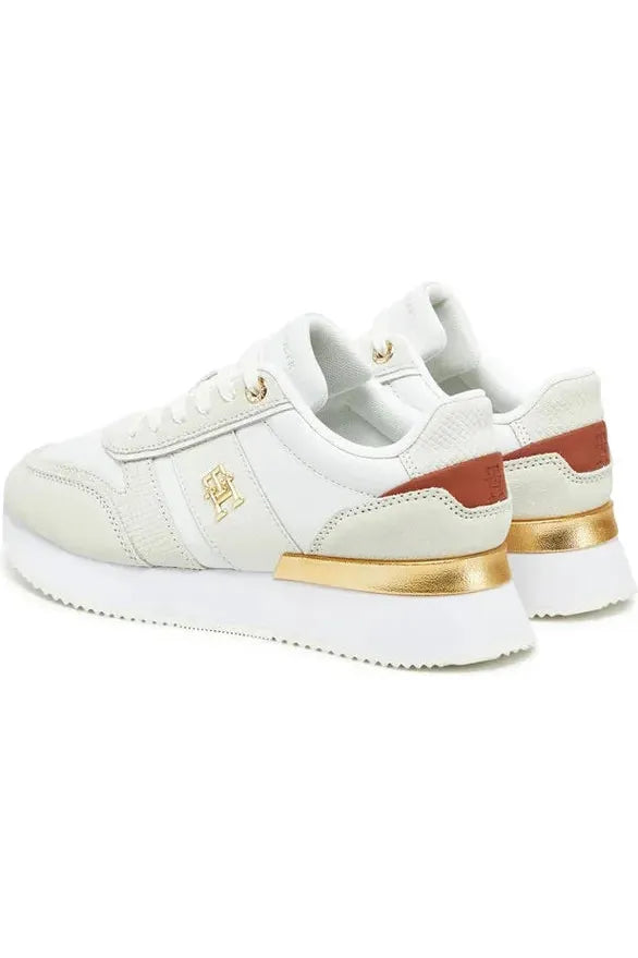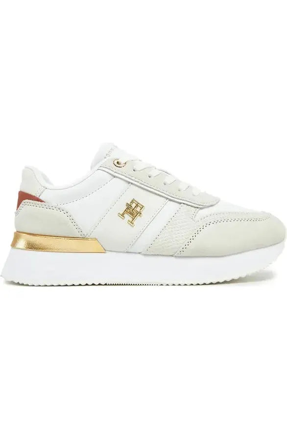 Experimente la combinación perfecta de cuero suave y gamuzado con un cierre de cordones en la parte delantera en estas zapatillas de deporte de moda. La suela gruesa presenta un elegante borde dorado metálico en la parte posterior, mientras que el icónico logotipo "TH" brilla en el costado y una marca en relieve agrega un toque refinado a la lengüeta.