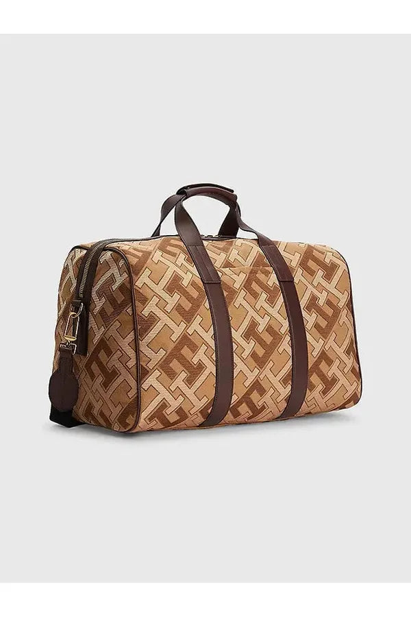 Esta espaciosa bolsa de deporte, confeccionada en mezcla de lana, luce un vistoso estampado de monogramas con acabado texturizado.