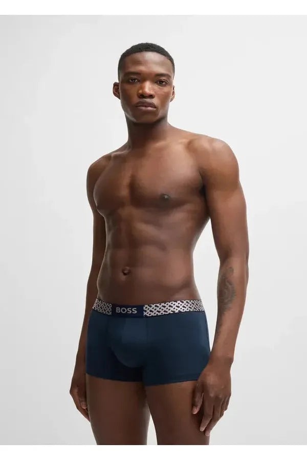 Tres calzoncillos BOSS supersuaves. Estas prendas de tiro medio elaboradas en punto elástico presentan un logo y monogramas en la cintura.