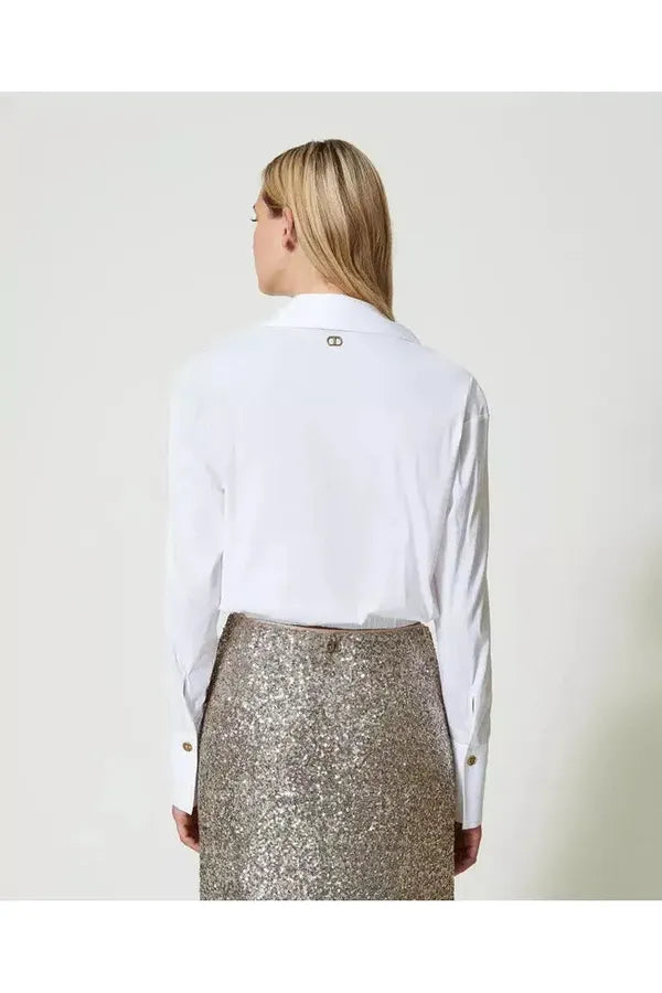 Blusa made in Italy de popelina de algodón elástico cruzada en la parte delantera superpuesto que se detiene en la parte inferior con pliegues. Tiene cuello camisero, mangas largas con hombros caídos, puños altos con abertura cerrada por un botón con logo en galvanizado latón, elástico oculto en la parte trasera para un efecto blusa y corte holgado. Este artículo forma parte de la selección «Archive», inspirada en las prendas más icónicas y admiradas de las colecciones de Twinset.
